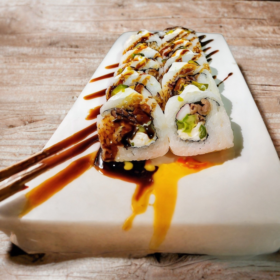 Alga, philadelphia, aguacate, res y pollo, por fuera chipotle, chile Monterrey y cheddar.