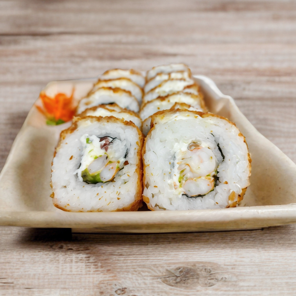 Cama de arroz empanizado, camarón, chipotle, queso Monterrey, pepino, zanahoria rallada, Tampico , aguacate y salsa anguila.