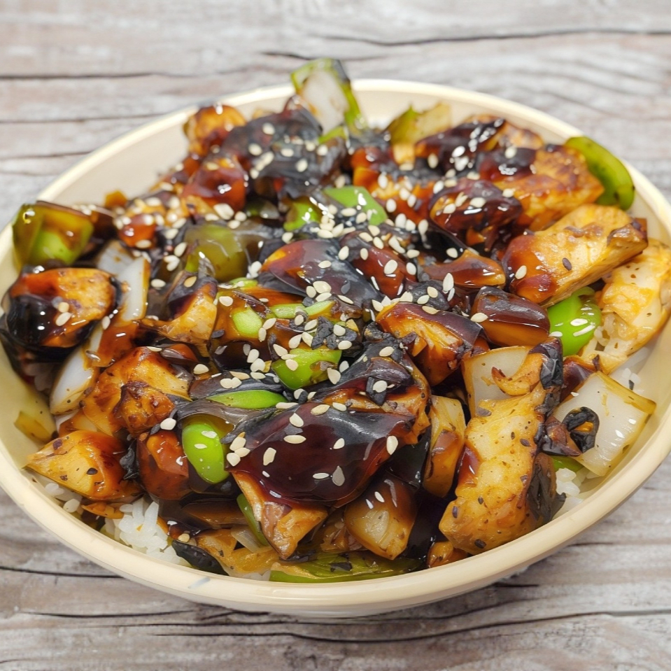 Cama de arroz blanco con proteína a elegir, pechuga de pollo,res o mixto con morrón verde y cebolla bañados en salsa teriyaki