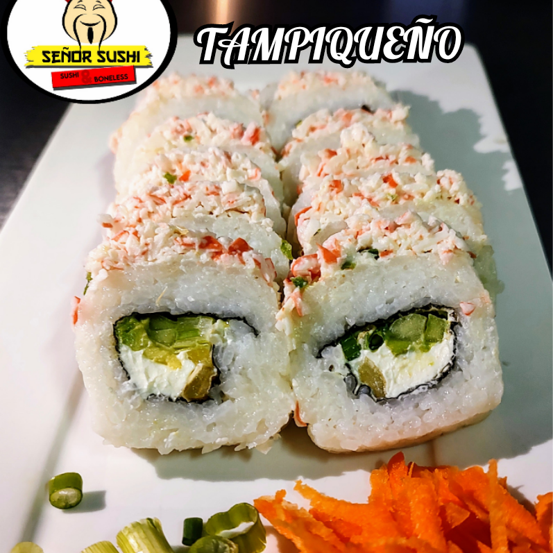Alga, philadelphia, aguacate, pepino, chile güerito, por fuera forrado de Tampico.