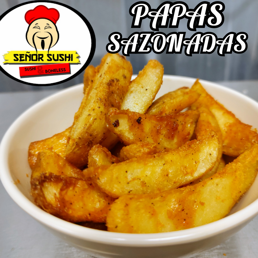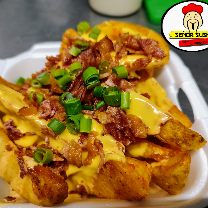 Papas sazonadas, chipotle , queso cheddar,tocino y un toque de cebollin