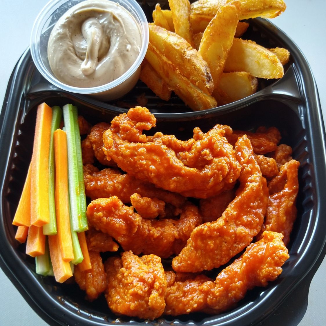 300 gr de pechuga empanizada y bañada en salsa de tu elección, acompañado de apio zanahoria y aderezo de la casa