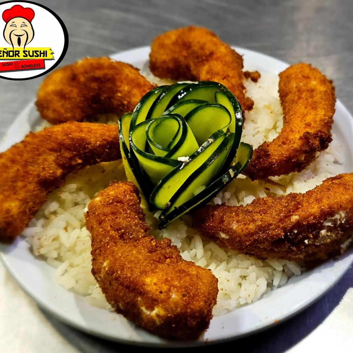 6 camarones rellenos de Philadelphia, empanizados sobre una cama de arroz blanco