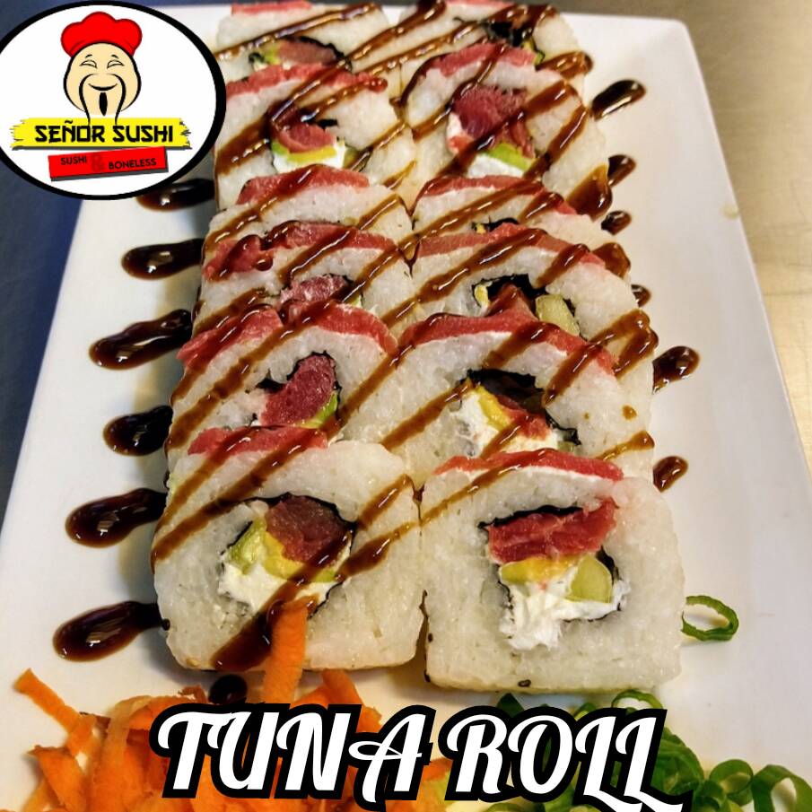 Alga, philadelphia, aguacate, pepino y atún, por fuera forrado con atún y salsa de anguila.