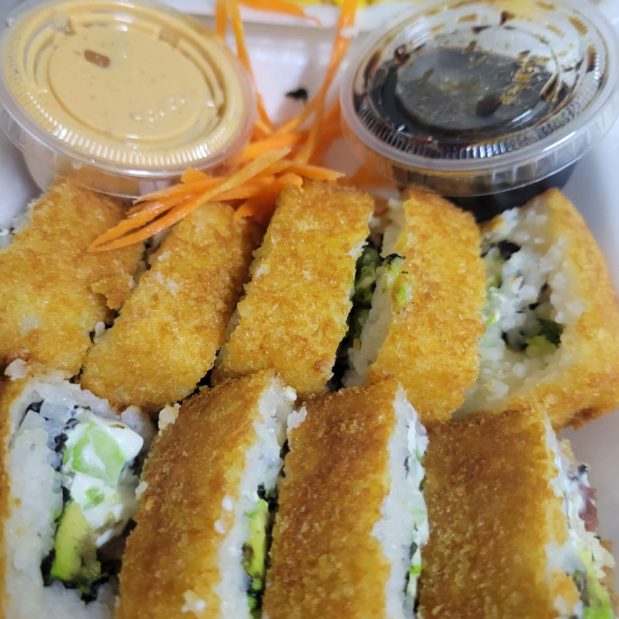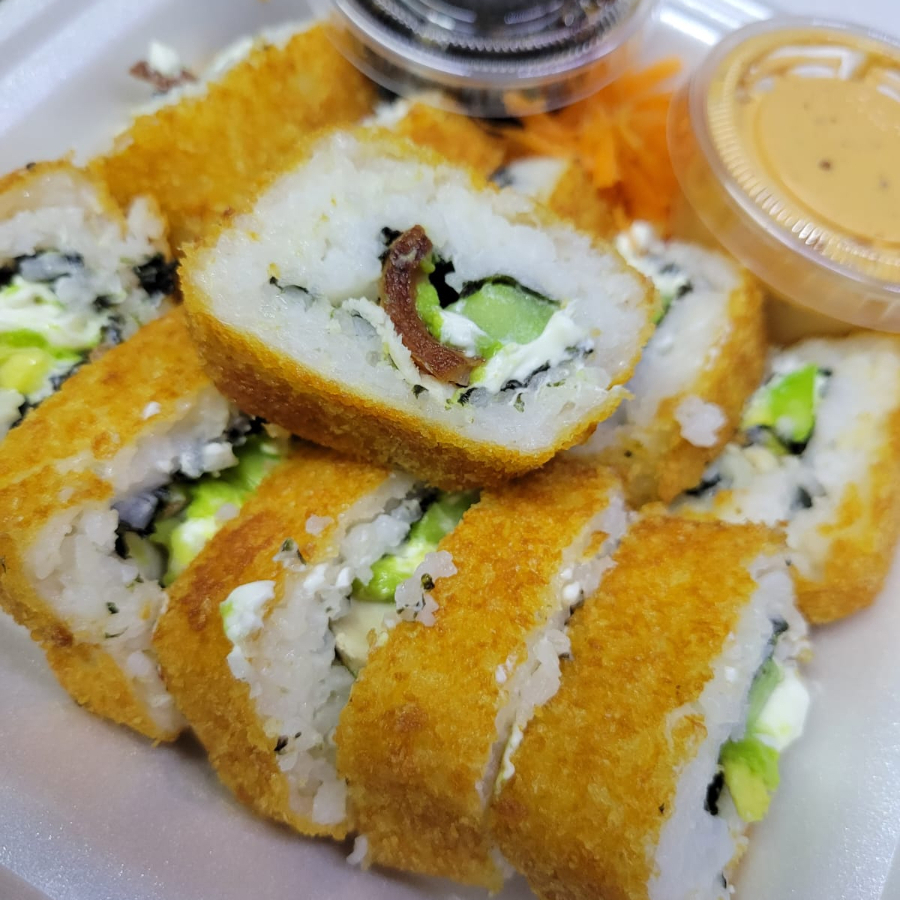 Pepino, aguacate, philadelphia, alga, pollo, camarón y res por dentro. Empanizado