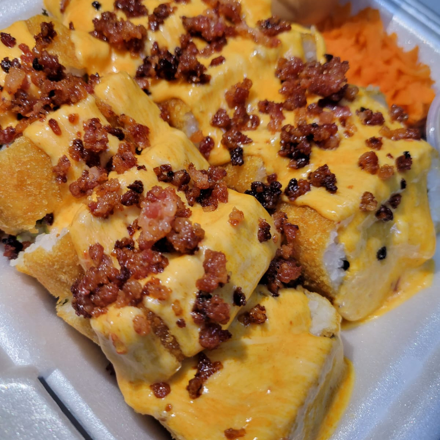 Camaron, queso crema, aguacate, pepino, bañado en queso para nacho, con toping de tocino.