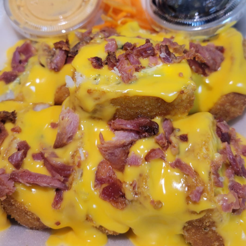 Milanesa de pollo empanizada, queso americano, aros de cebolla, tocino, bañada en chipotle. Acompañada de 150gr de papas y jalapeños