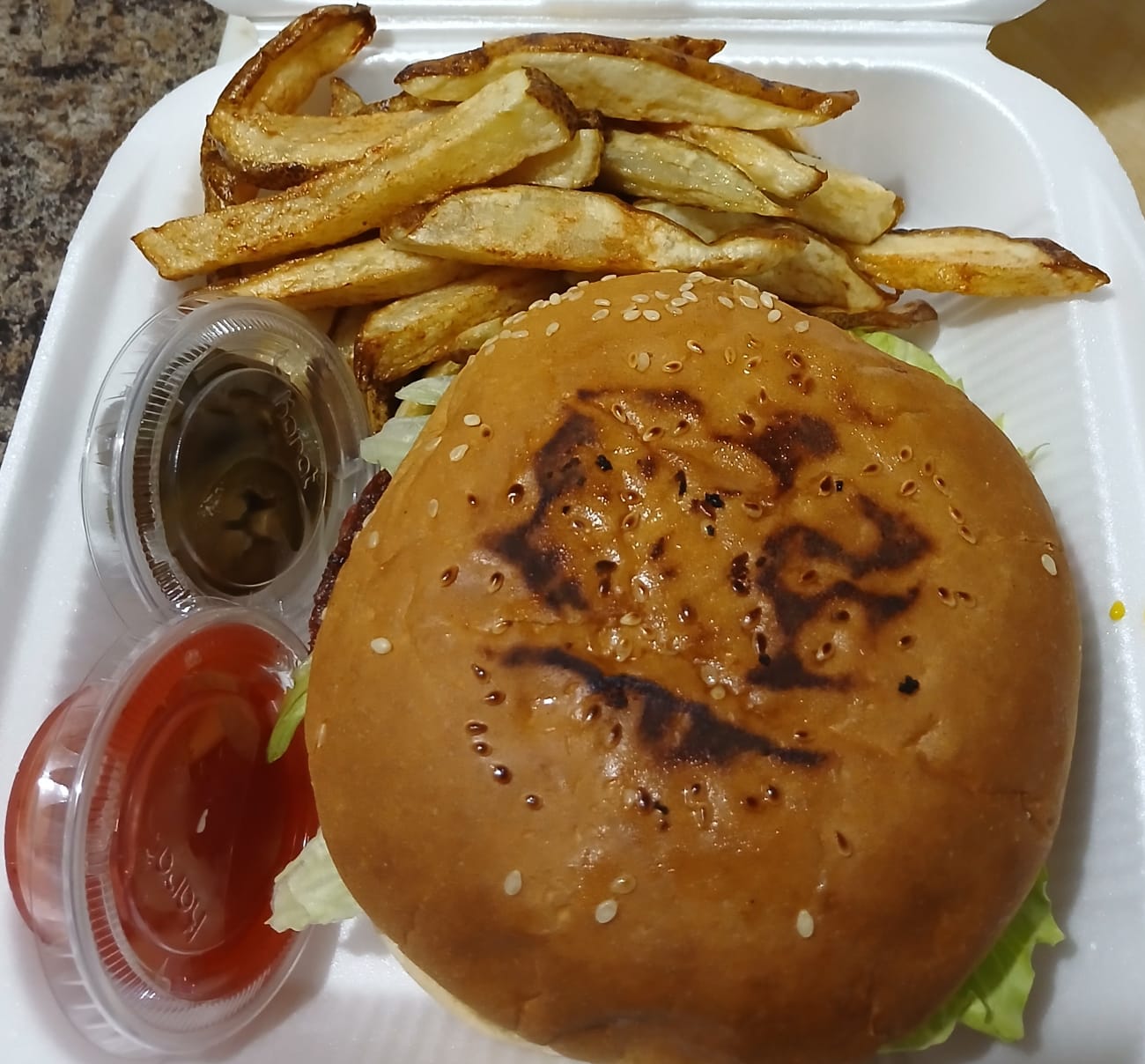 Hamburguesa con lechuga, tomate, cebolla, cátsup, mostaza y mayonesa con papas
