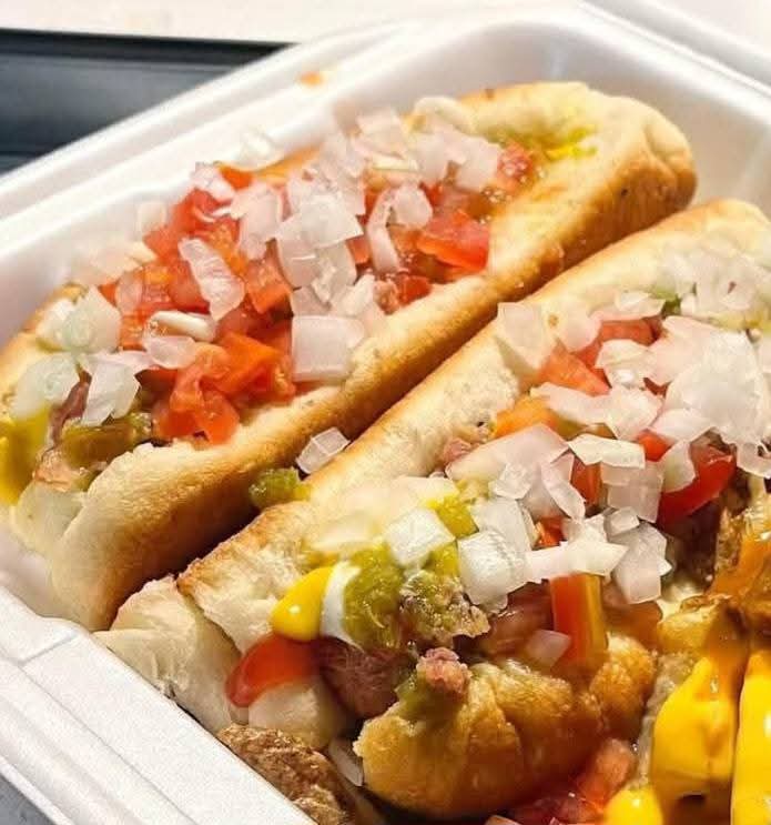 Hotdog con tomate, cebolla, cátsup, mostaza y aderezo