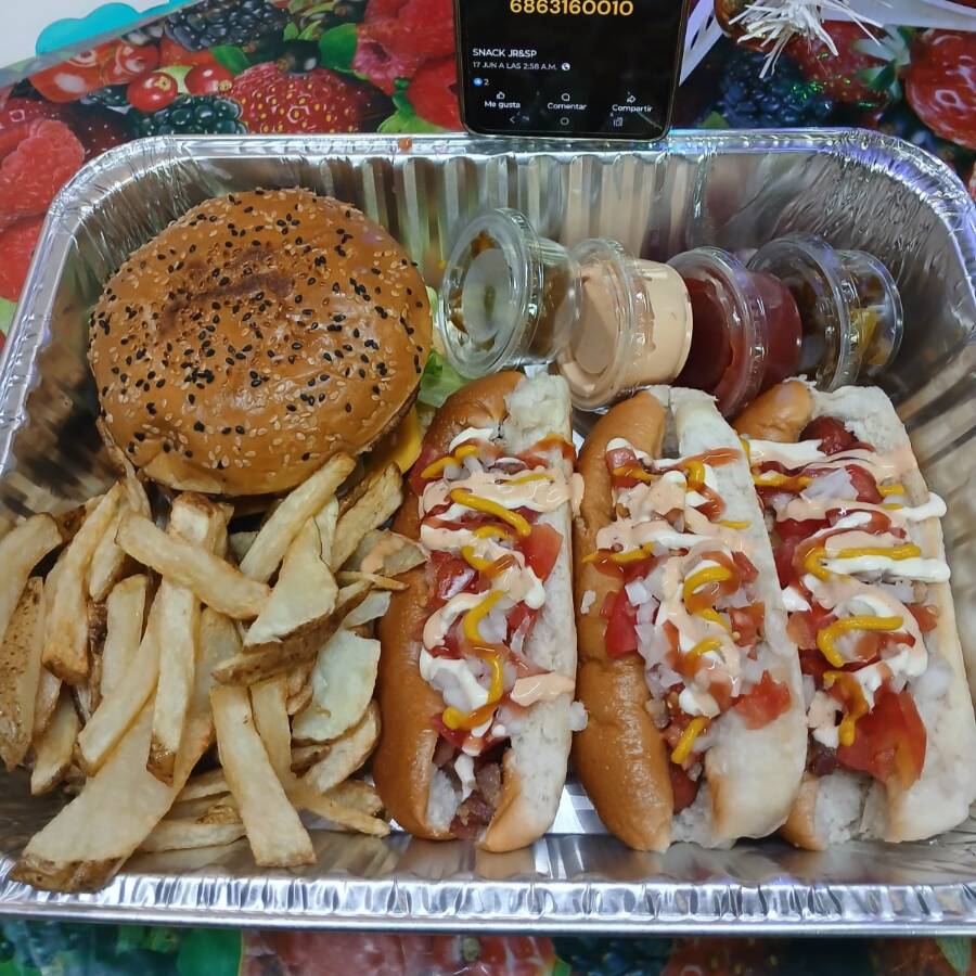 Charola de Hotdog X3 + 1 Hamburguesa y Papas
