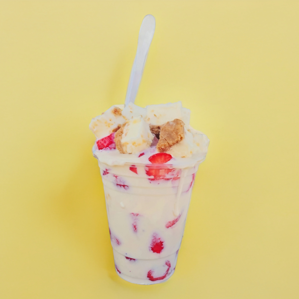 Fresas frescas servidas con crema dulce estilo casero. Vaso 14onz