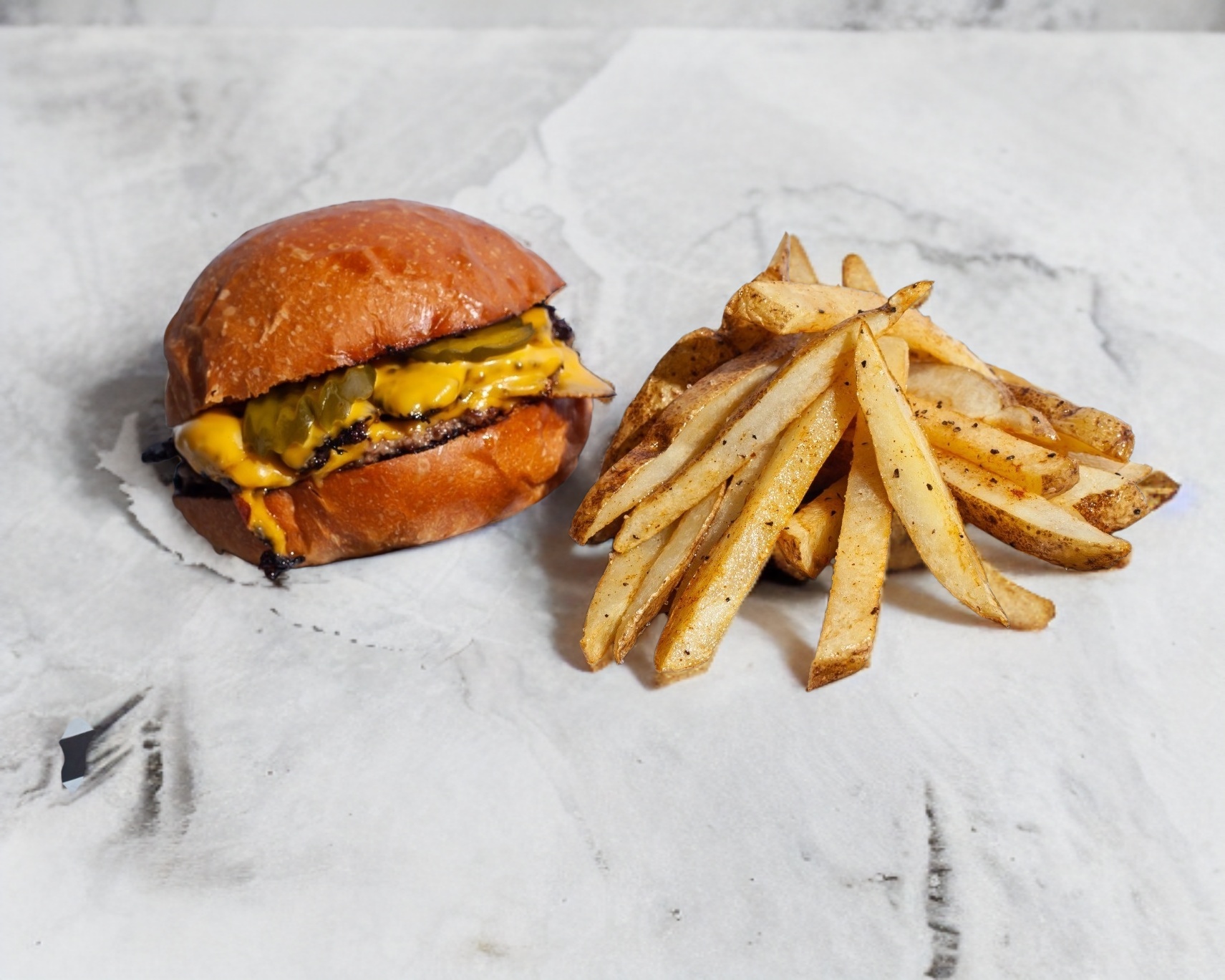 90gr de carne 100% de res, pan artesanal, extra queso derretido, crujiente cebolla, pepinillo y nuestro aderezo especial de la casa. Acompañado con Papas fritas sazonadas!!