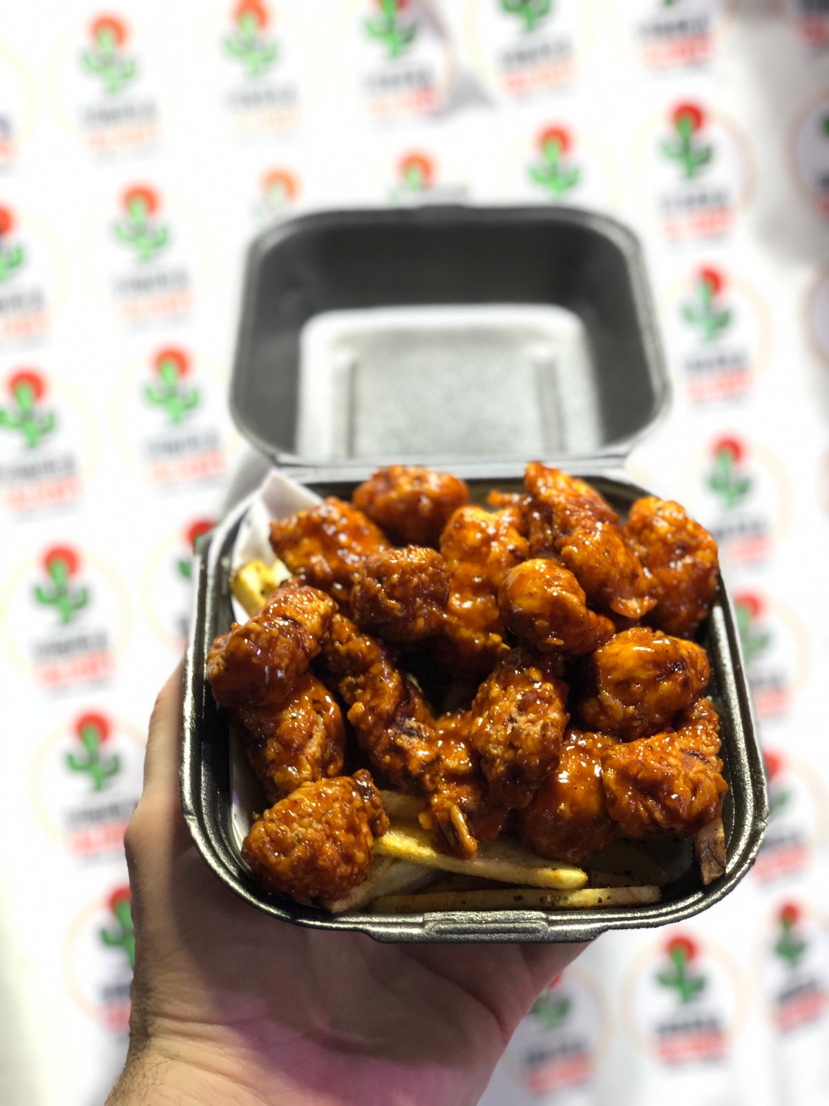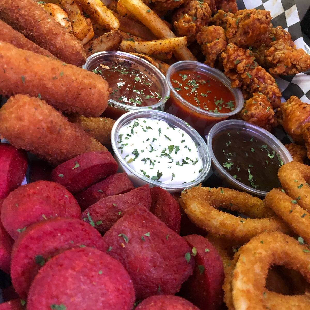 250gr de boneless, 180gr de papas fritas, bubas, 10 aritos de cebolla, 5 deditos de queso, aderezos bbq, ranch, chile amor y ketchup!! Con la salsa de tu eleccion o naturales
