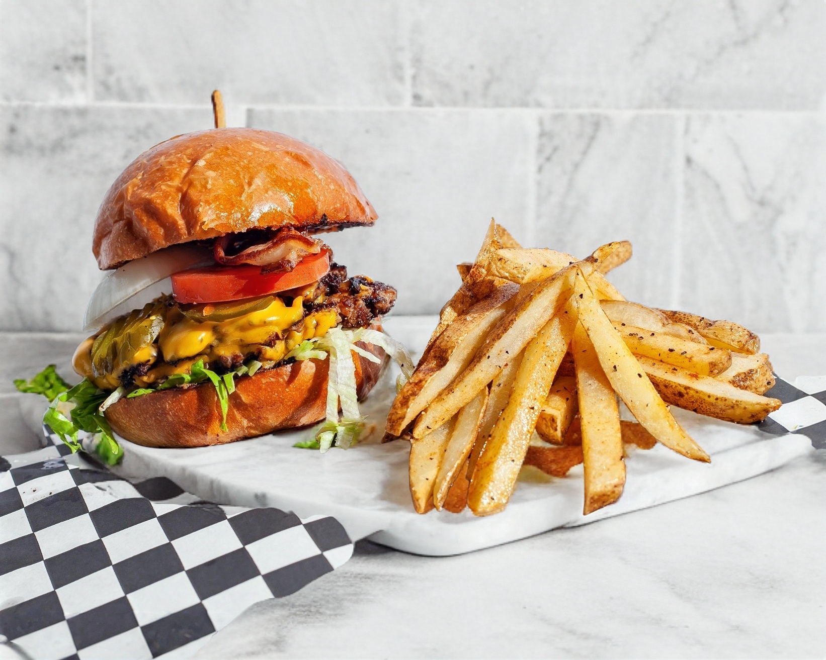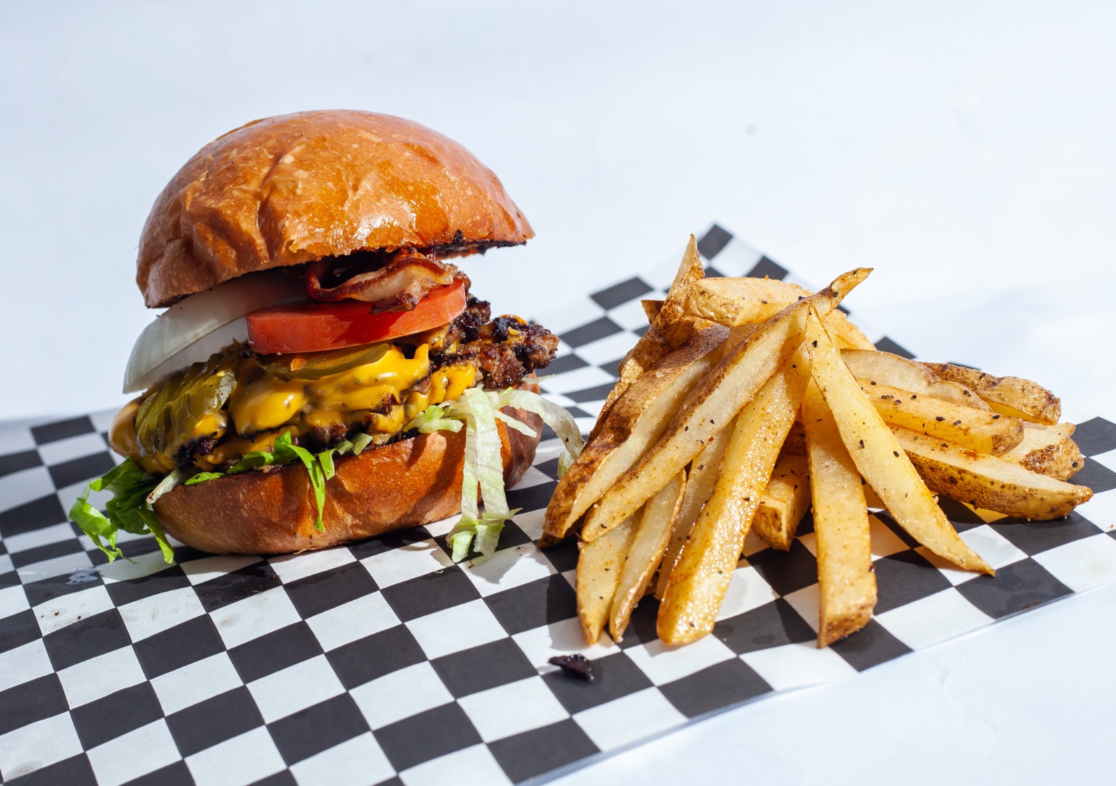 Hamburguesa de 90 gr de carne 100% res, queso derretido, pan artesanal, lechuga, tomate, cebolla, pepinillos, tocino y aderezo de la casa; acompañada de una porción de papas fritas sazonadas
