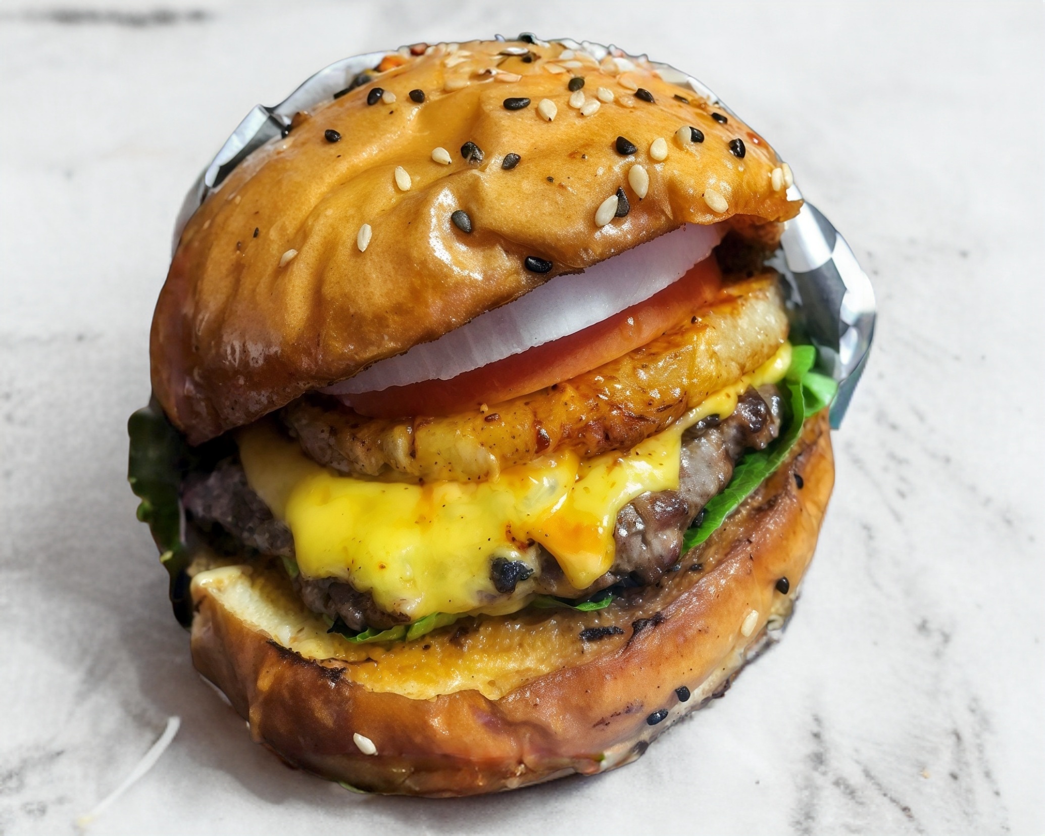 Hamburguesa con 180g de carne 100% de res, pan artesanal, piña asada sazonada, tomate fresco y cebolla; tiras de tocino crujiente y queso amarillo fundido, coronado con nuestro. aderezo especial de la casa.