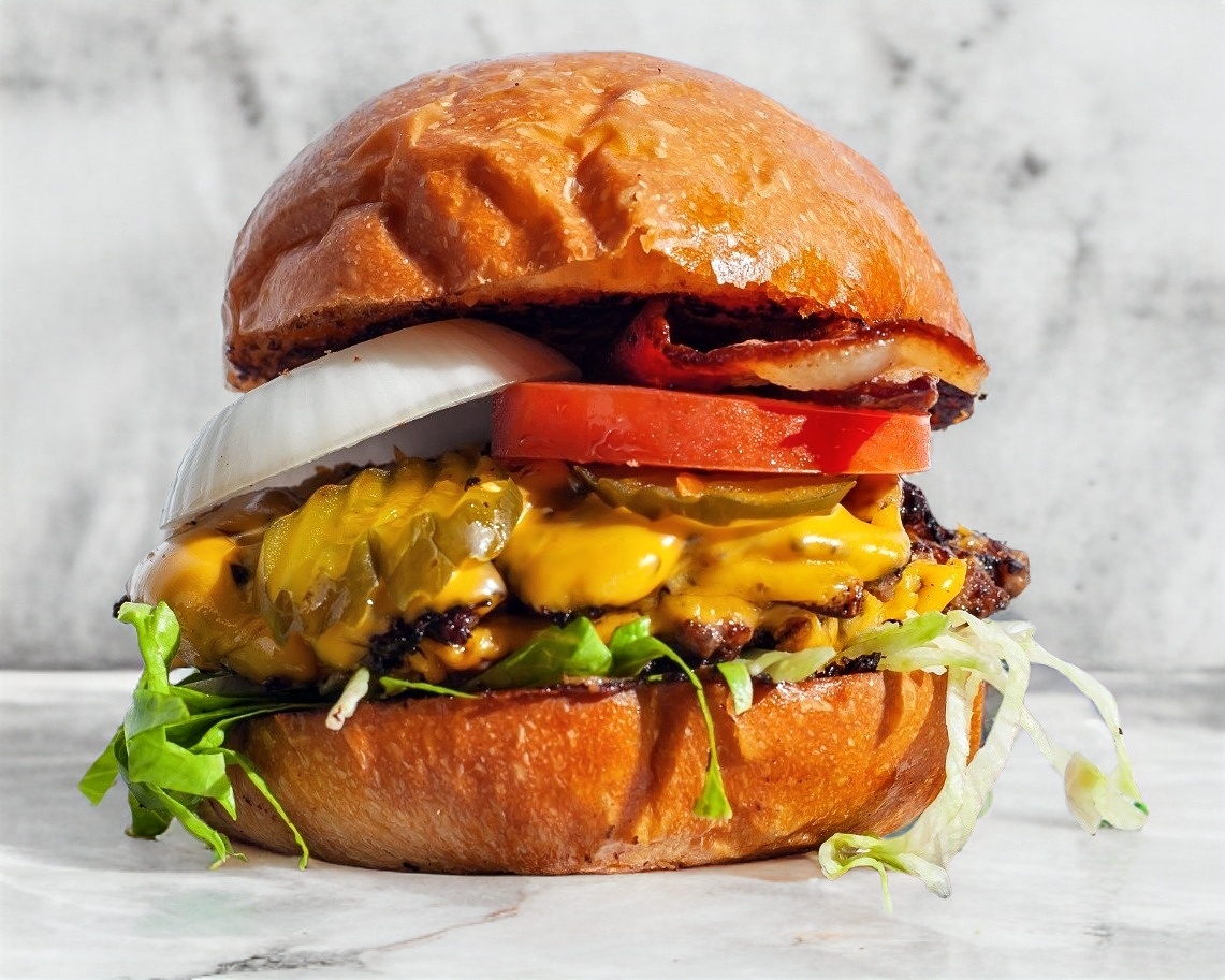 90gr de carne 100% de res, queso derretido, pan artesanal, lechuga, tomate, cebolla, pepinillos, tocino y aderezo de la casa!!