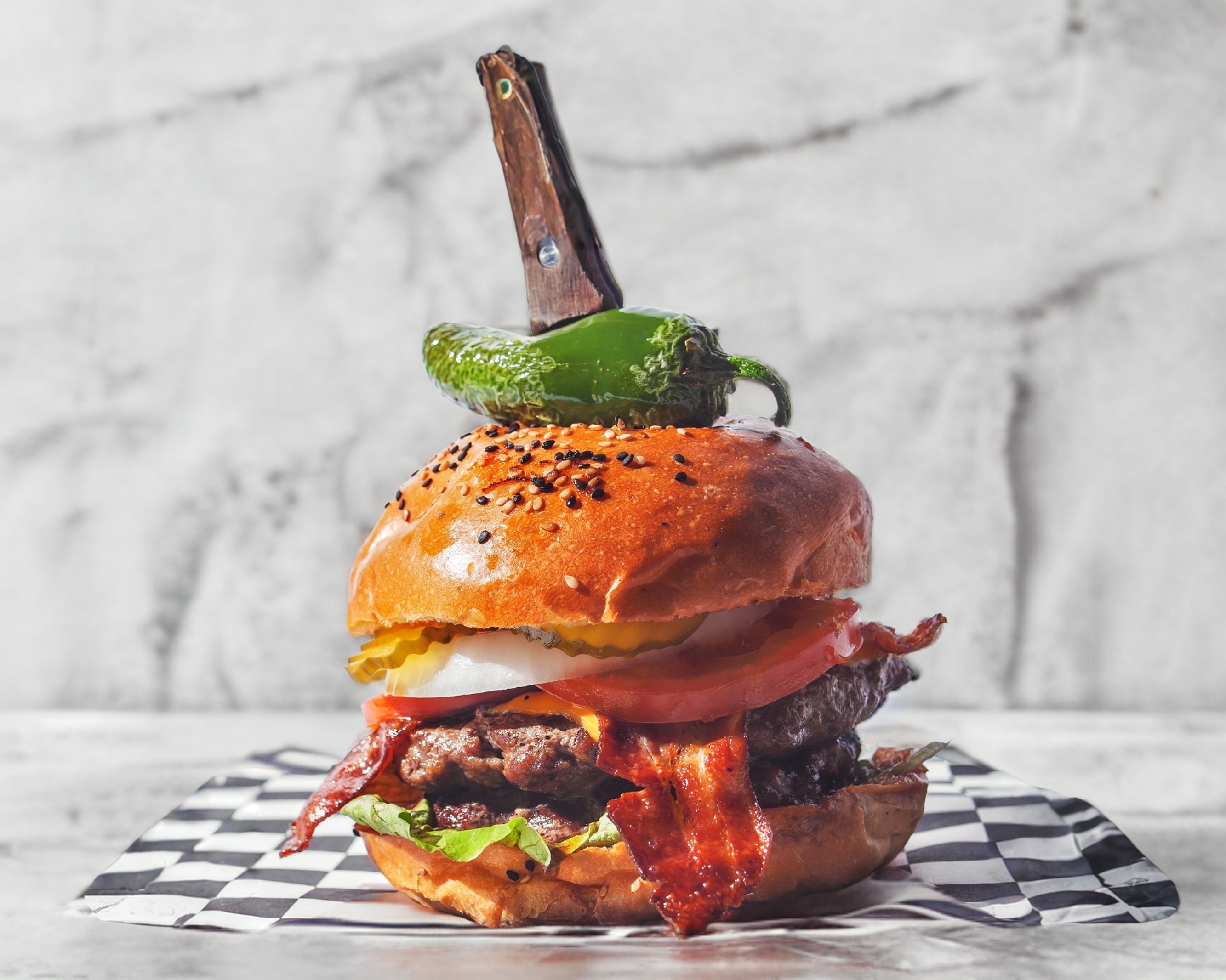 DOBLE CARNE(360gr)!! DOBLE TOCINO!! DOBLE QUESO!! Lechuga hidroponica, tomate, cebolla, pepinillos, aderezo de la casa!! Acompañado con jalapeño frito!!