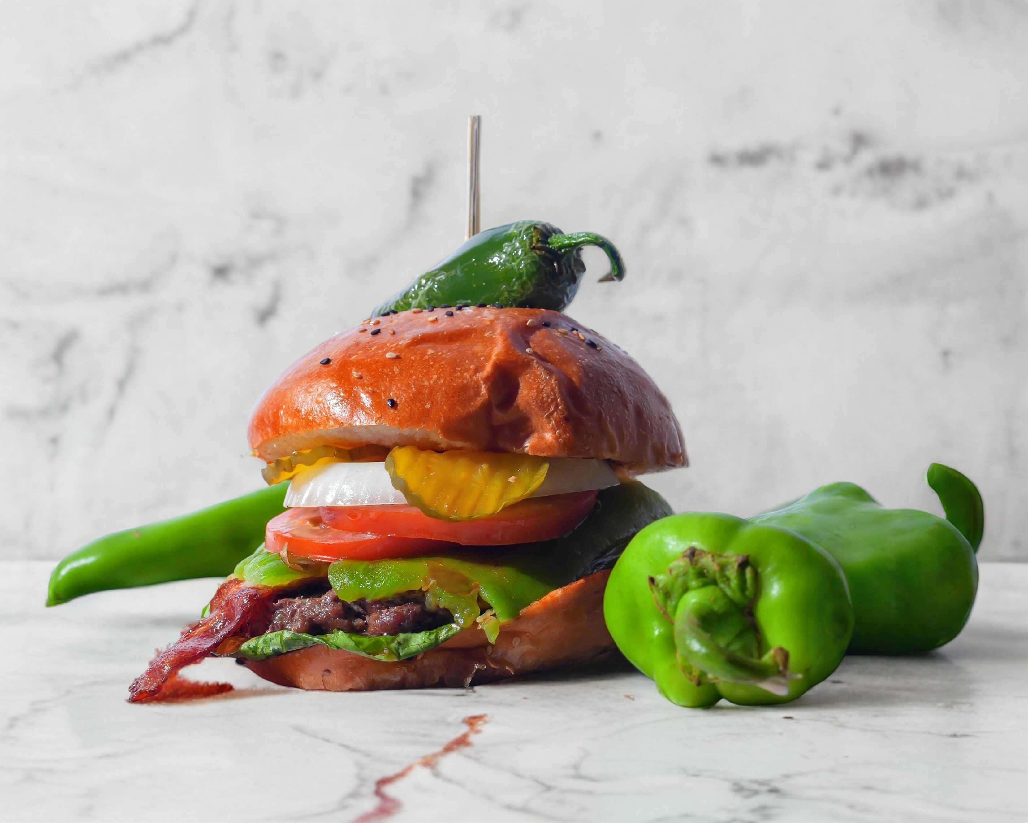 180gr de carne 100% de res, tocino, chile california tatemado, pan artesanal, pepinillos, tomate, lechuga hidroponica, cebolla! Aderezo de la casa. Acompañada de jalapeño frito!!