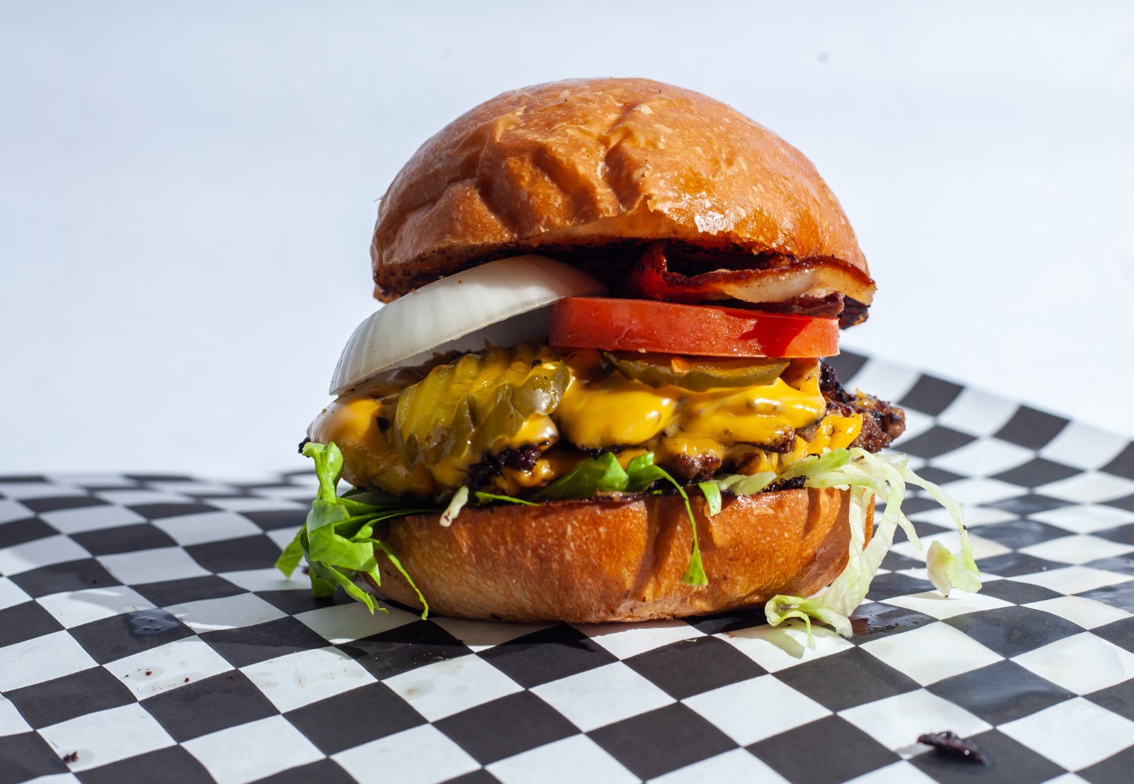 DOBLE CARNE(360gr)!! DOBLE TOCINO!! DOBLE QUESO!! Lechuga hidroponica, tomate, cebolla, pepinillos, aderezo de la casa!! Acompañado de papas fritas sazonadas y jalapeño frito!!