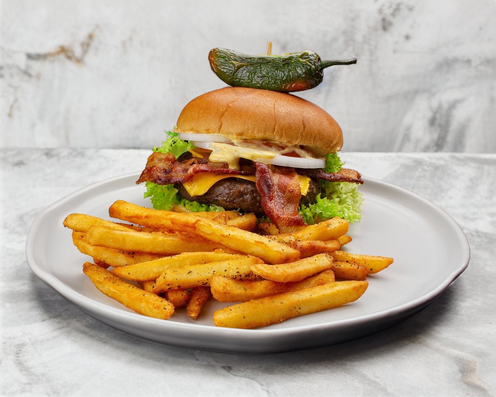 180gr de carne 100% de res, pan artesanal, lechuga hidroponica, tomate, cebolla, pepinillos, crujiente tocino, aderezo de la casa!! Acompañado con papas fritas sazonadas y jalapeño frito!!