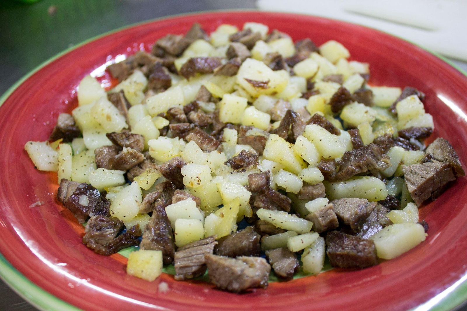 Carne de pecho en cuadritos y papa dorada en cuadritos. Incluye 3 tostadas y un consome grande