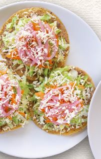 Orden de tres tostadas doradas de carne deshebrada o pollo, incluye consomé chico.