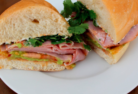 Con jamón, queso amarillo, queso suizo, tomate, cebolla y aderezo.