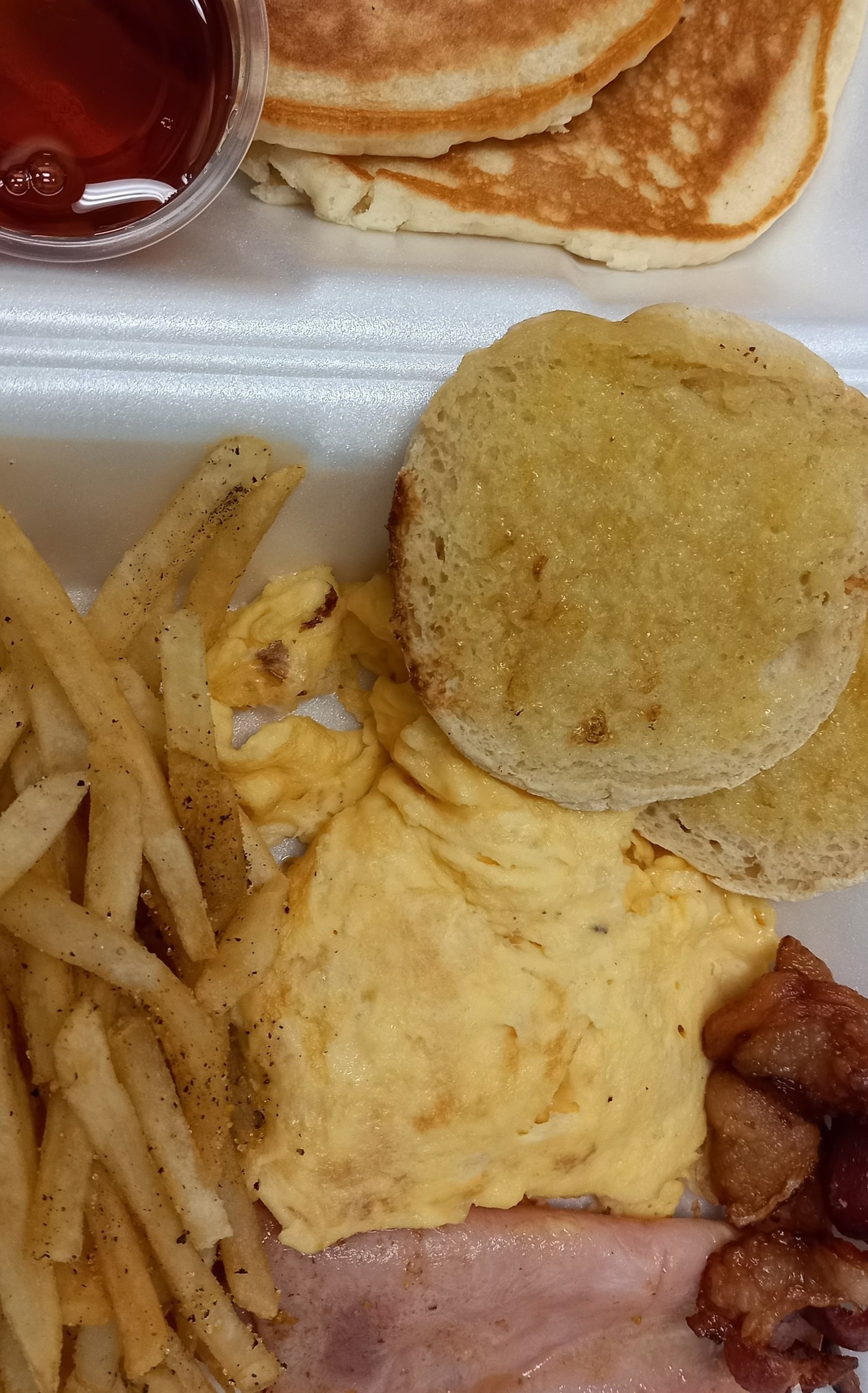 2 Hot cakes, 2 huevos con jamón y tocino, acompañado de, papas y pan muffin con mantequilla.