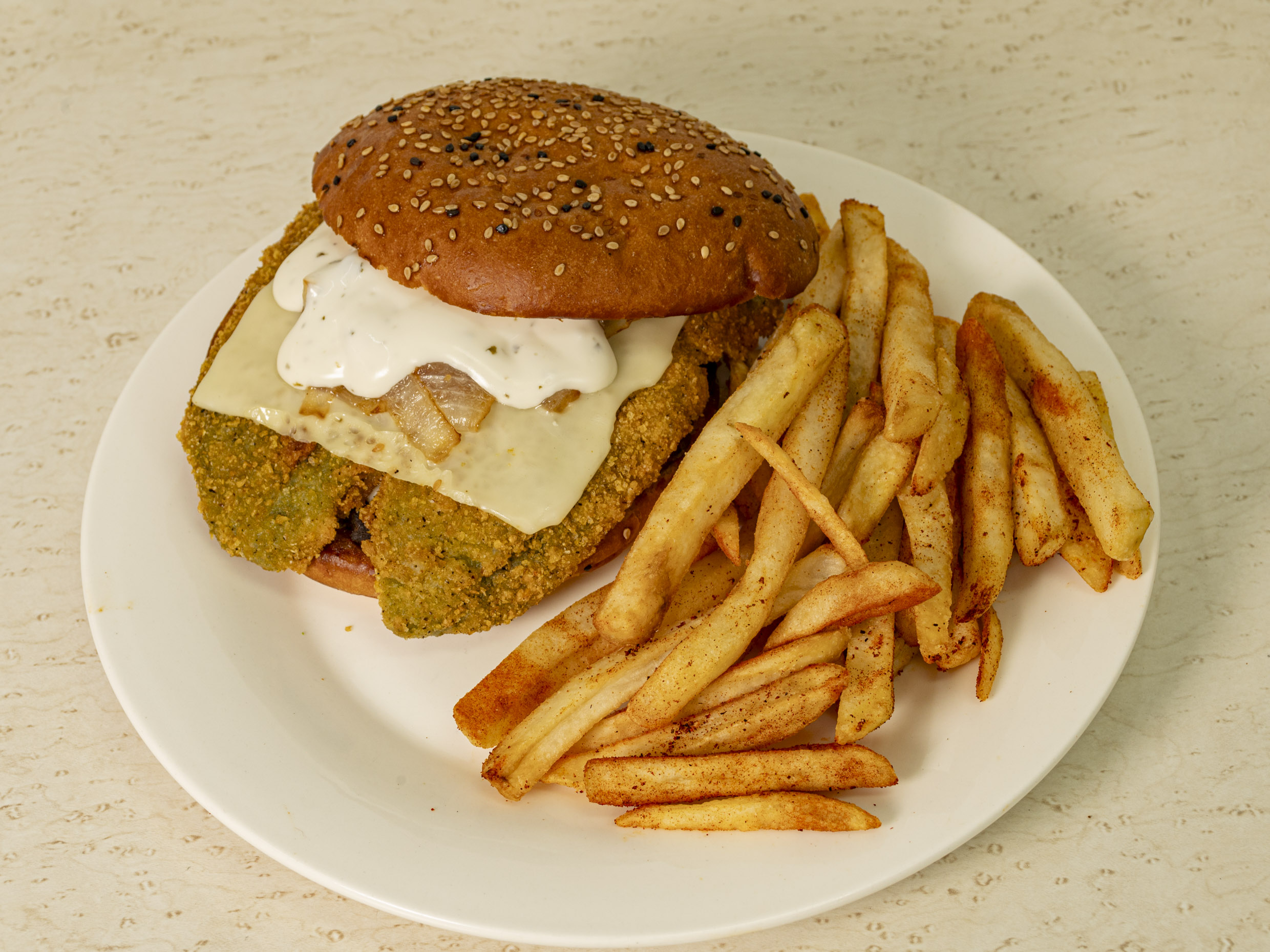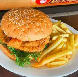 Pechuga crispy, queso suizo, lechuga, tomate, cebolla y aderezo. Acompañada con papas fritas.