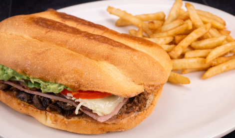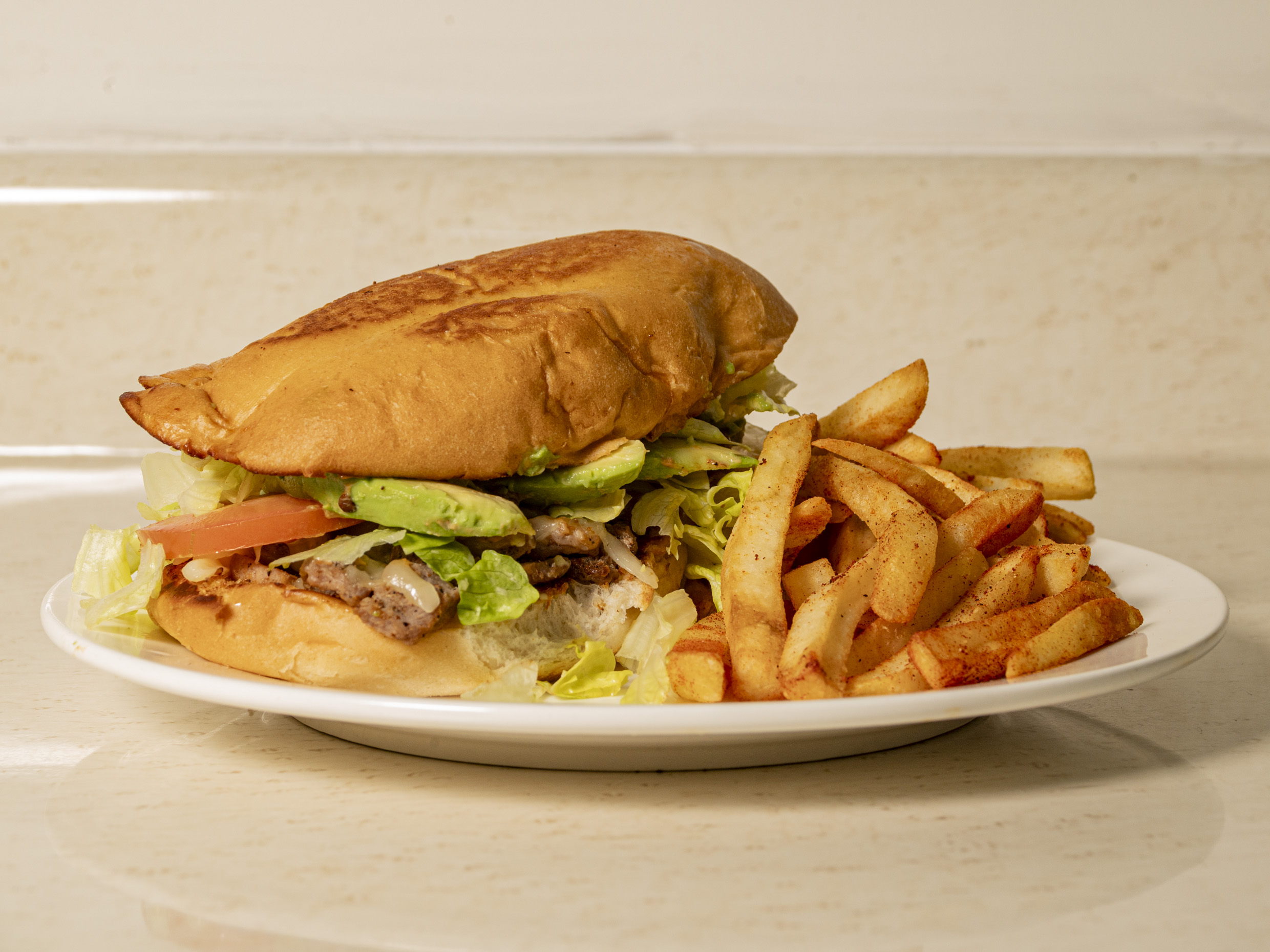 Lomo adobado, lechuga, cebolla morada, tomate, y aderezo. Acompañada de papas fritas.