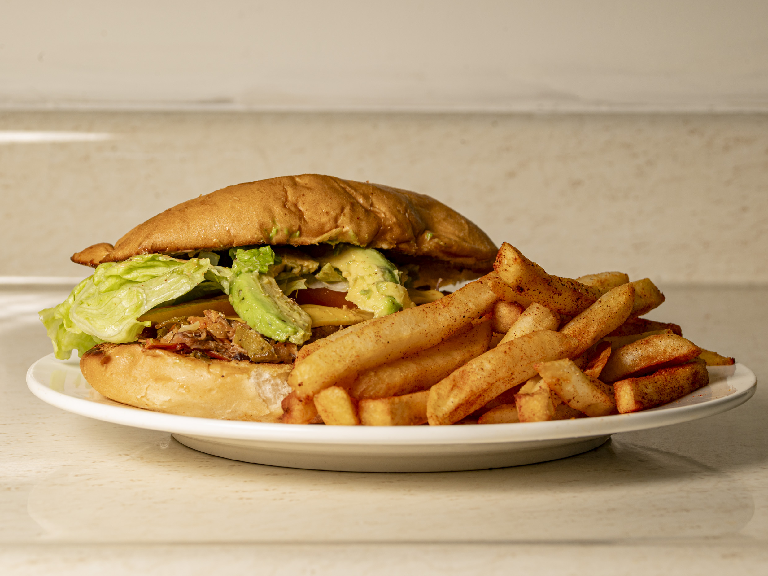 Carne deshebrada, lechuga, cebolla morada, aguacate, tomate y aderezo. Acompañada de papas fritas.