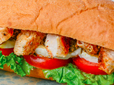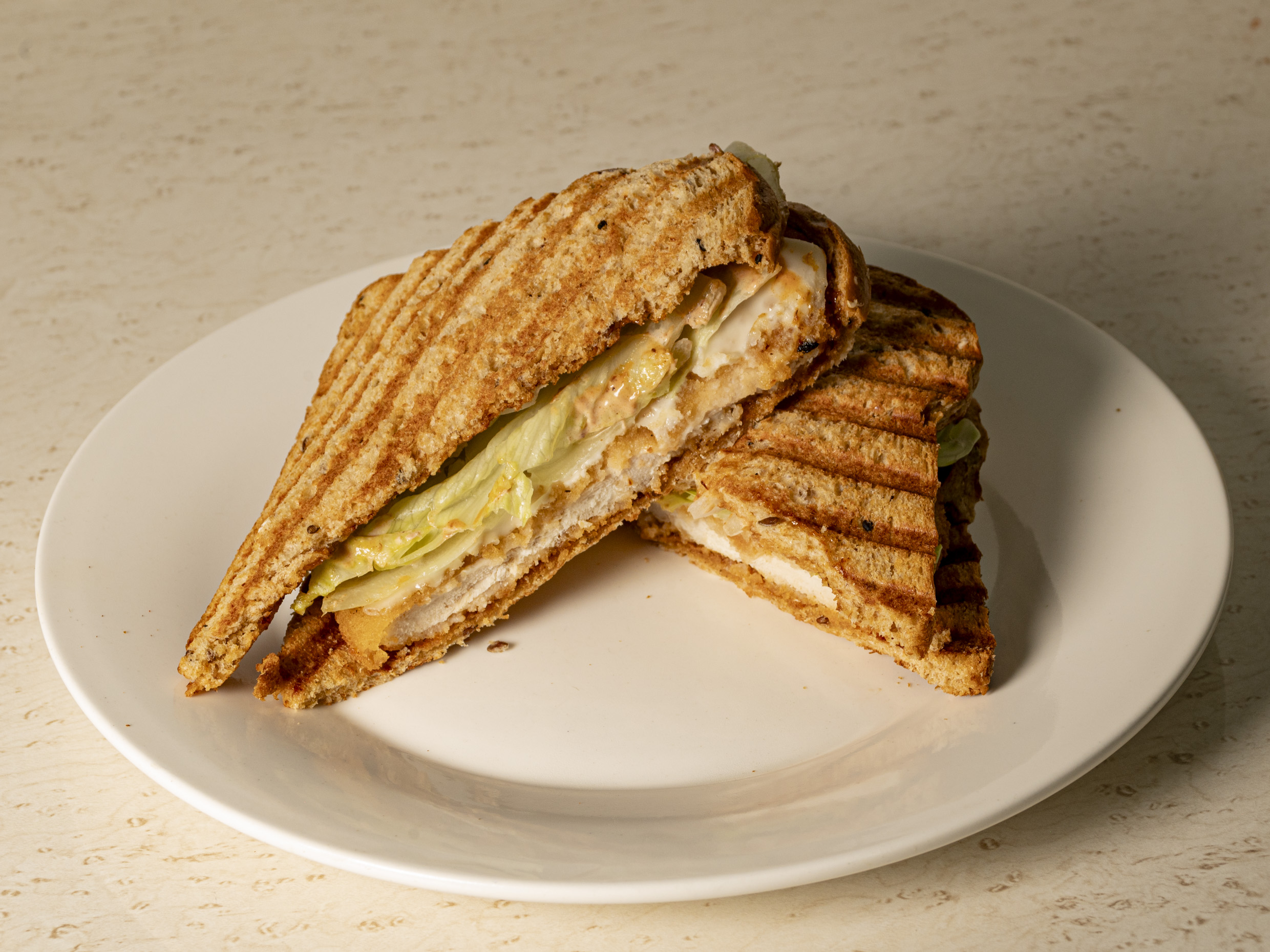 2 panes multigrano, pechuga de pollo a la parrilla, lechuga y tomate.