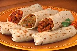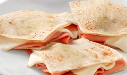 4 tortillas de harina con queso y jamón acompañado de frijoles puercos.