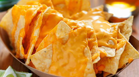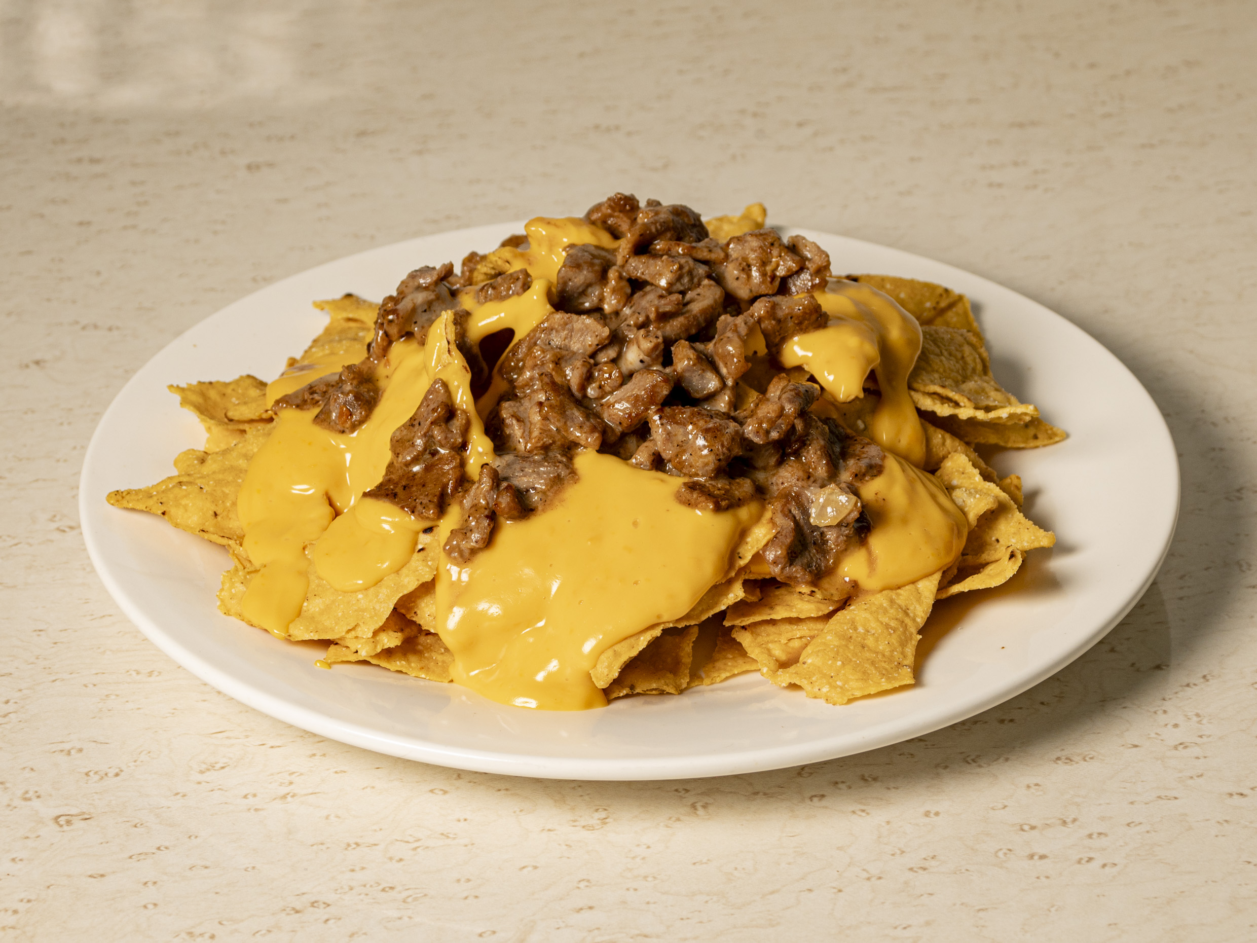 Totopos con carne asada bañados en queso de nachos y chiles jalapeños.