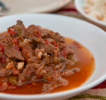 Orden de bistec ranchero jugoso, acompañado de tortillas de harina, frijoles puercos y papas.