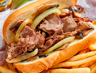 Sirlon premium, queso, cebolla caramelizada con ajo y pimiento morrón. Acompañado con papas fritas.