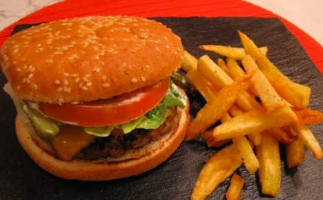 Con queso suizo, aros de cebolla empanizados, BBQ y tocino. Con papas fritas