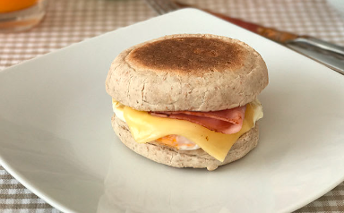 Muffin con huevo, queso y jamón servido con papas a la francesa.