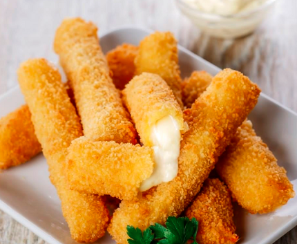 6 dedos de queso mozzarella empanizados con aderezo ranch.