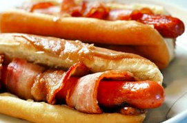 Salchicha de res grande con tocino y verdura. Acompañado de papas sazonadas.