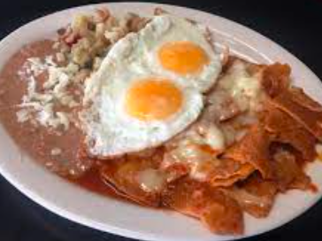 Chilaquiles rojos o verdes con crema y queso, acompañados de huevos revueltos, frijoles.