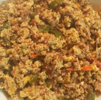Carne deshebrada con verdura revuelta huevo, acompañado con tortillas de harina, frijoles puercos y papas.