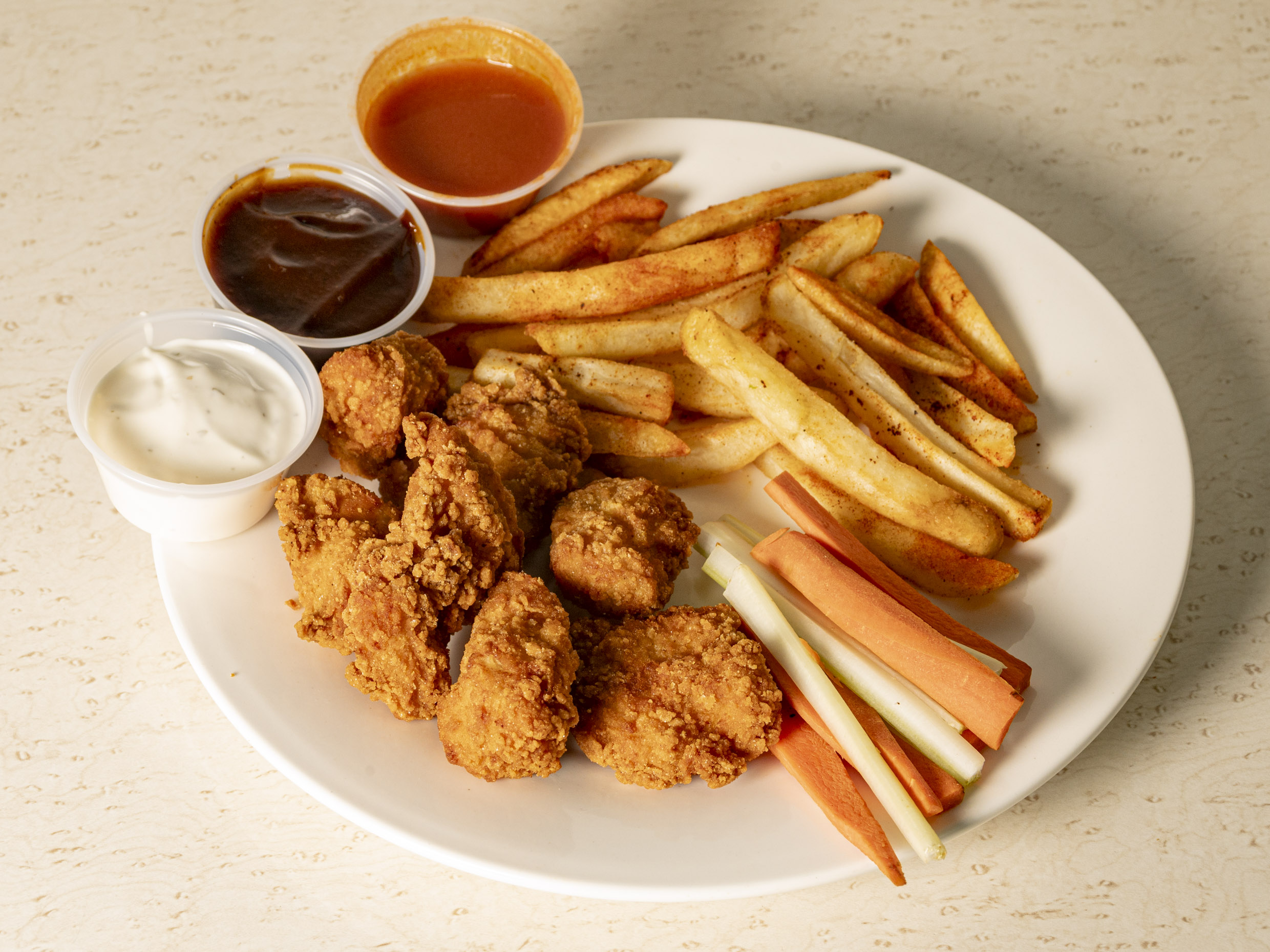 250grs de BONELESS de pechuga de pollo,bastones de apio y zanahoria con aderezo rancho y salsa BBQ y salsa hot wings