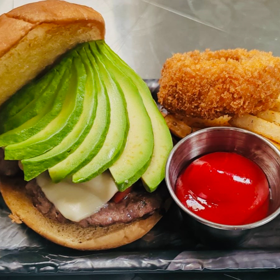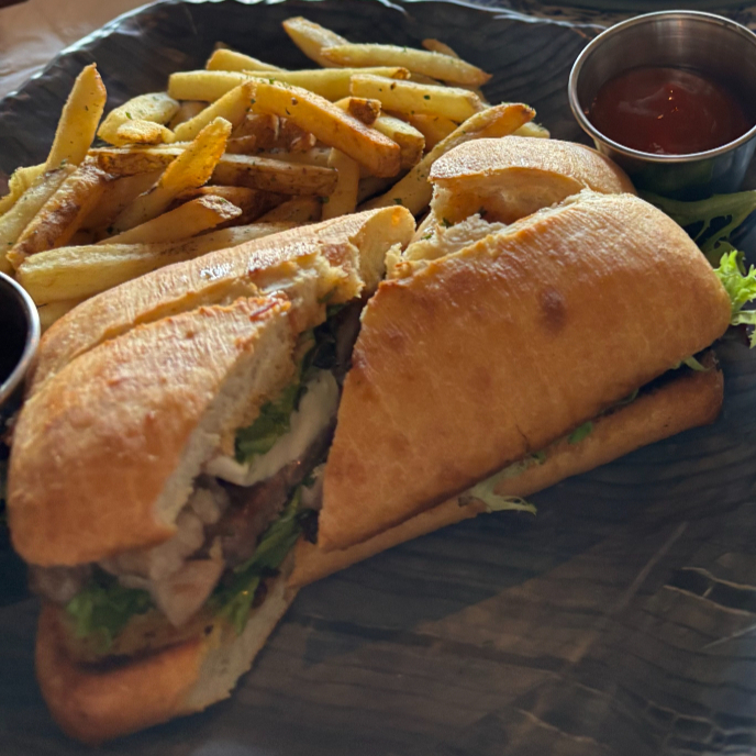 150 g de pechuga de pollo, queso mozarella fresco, lechugas mixtas y mayonesa chipotle con un toque de chimichurri acompañado de papas fritas