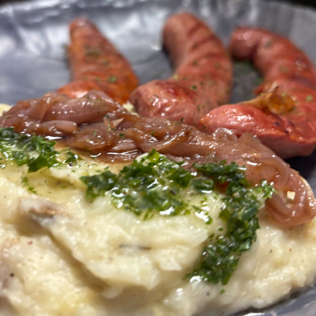 Trio de Salchicha Polaca, Chorizo Español y Chorizo Argentino acompañado de pure de papa preparado con queso parmesano, cebolla carameliada y un toque de chimichurri