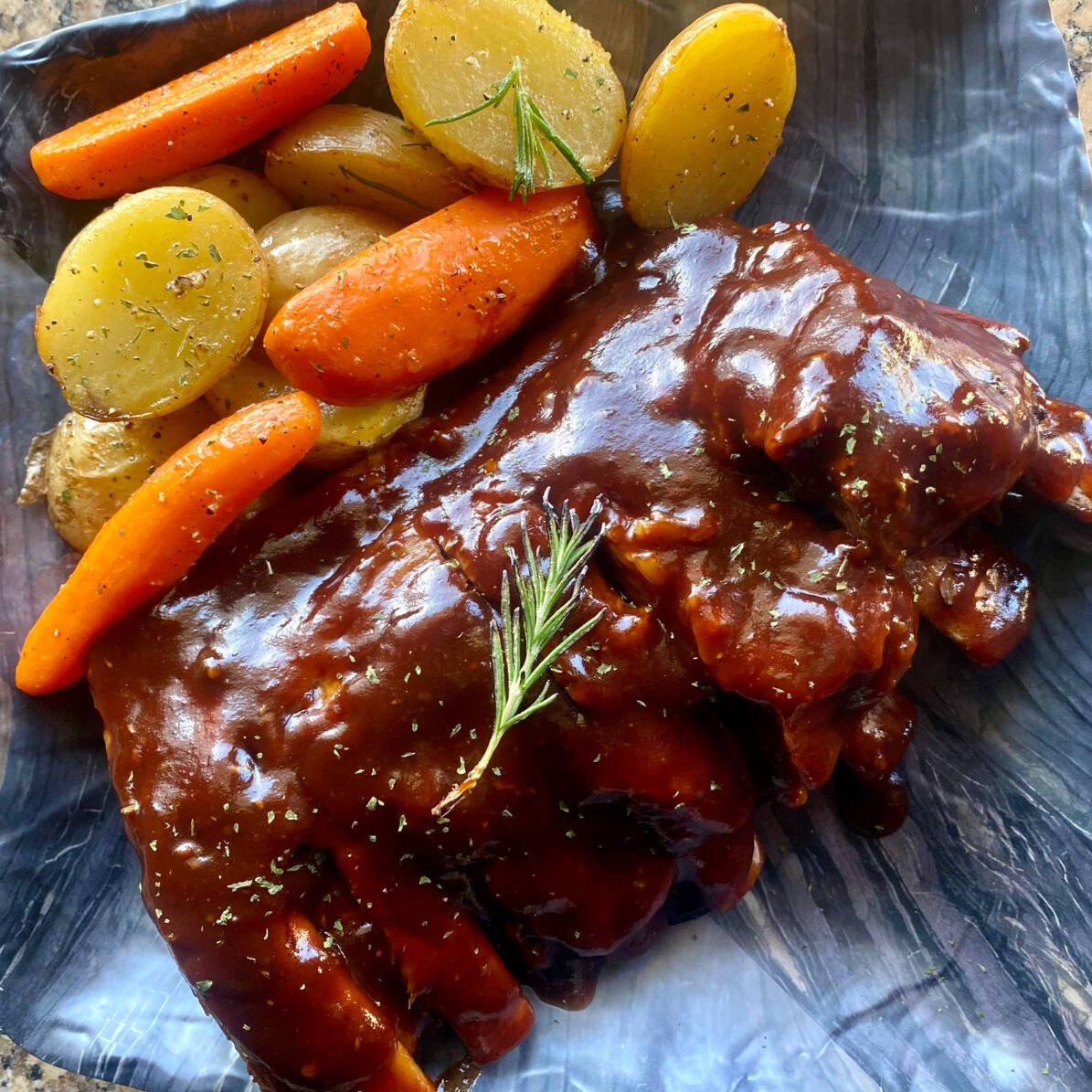 Medio Costillar de Cerdo bañado en nuestra salsa BBQ de la casa acompañado de papas cambray y zanahoria