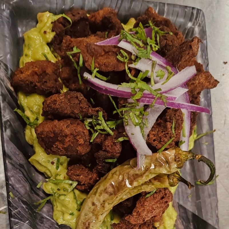 Aguja Norteña en Chicharron montado sobre guacamole acompañado con mezcla de salsas negras y tortillas de maiz