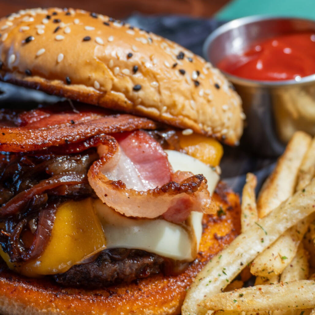 Carne premium, Tocino, Cheddar, Jack, BBQ, Papas francesas sazonadas.