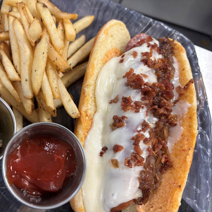 Salchicha Kiolbassa acompañado de tocino, cebolla carmelizada y queso mozzarella