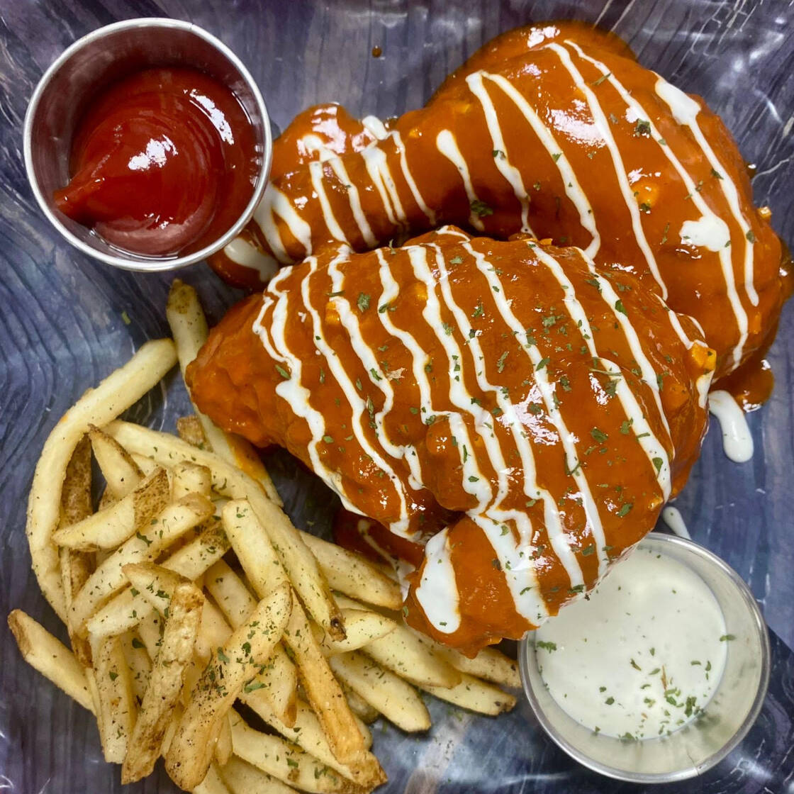 Medio Pollo troceado frito bañado en salsa buffalo con un toque de ranch acompañado de papas fritas